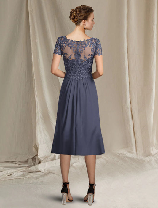 A-Line Mother of the Bride Dress Plus Size Elegant V Neck Tea Length Chiffon Lace Short Sleeve with Pleats Appliques