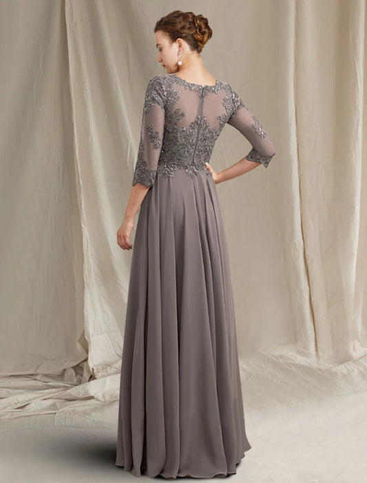 Sheath / Column Mother of the Bride Dress Plus Size Elegant Jewel Neck Floor Length Chiffon Lace 3/4 Length Sleeve with Pleats Appliques