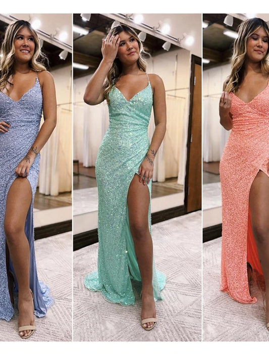 Mermaid / Trumpet Prom Dresses Sparkle & Shine Dress Formal Wedding Guest Sweep / Brush Train Sleeveless V Neck Sequined Backless with Sequin