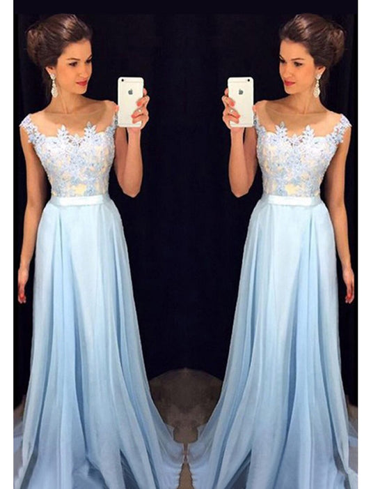 A-Line Prom Dresses Color Block Dress Formal Prom Floor Length Sleeveless Jewel Neck Chiffon with Beading Appliques