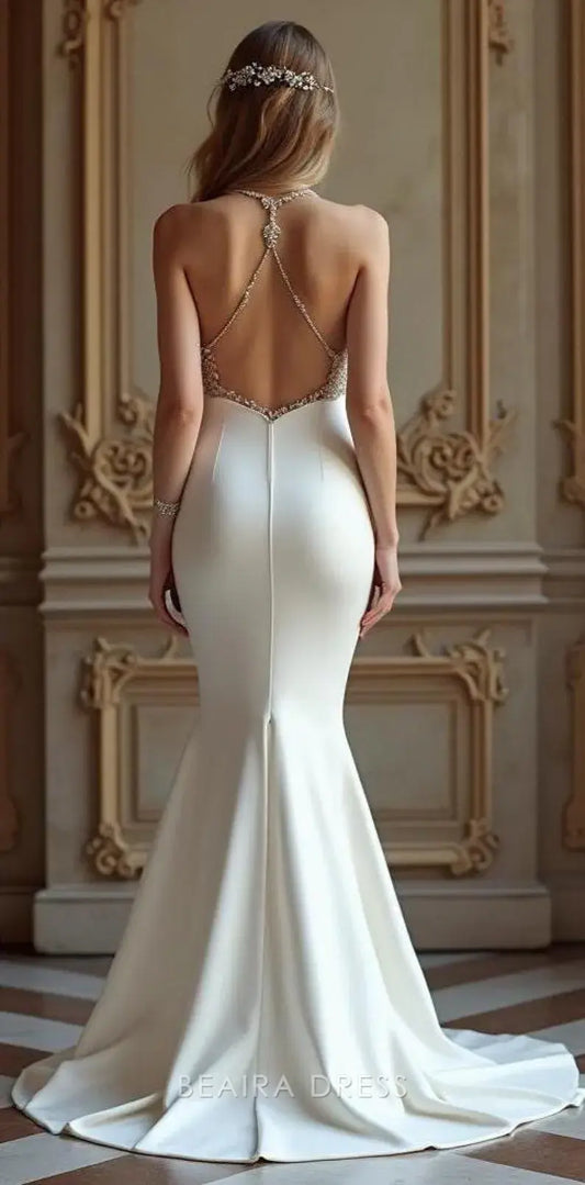 Elegant Plunging V - Neck Halter Mermaid Wedding Dress with Crystal Back and Waist Detail Prom Dress