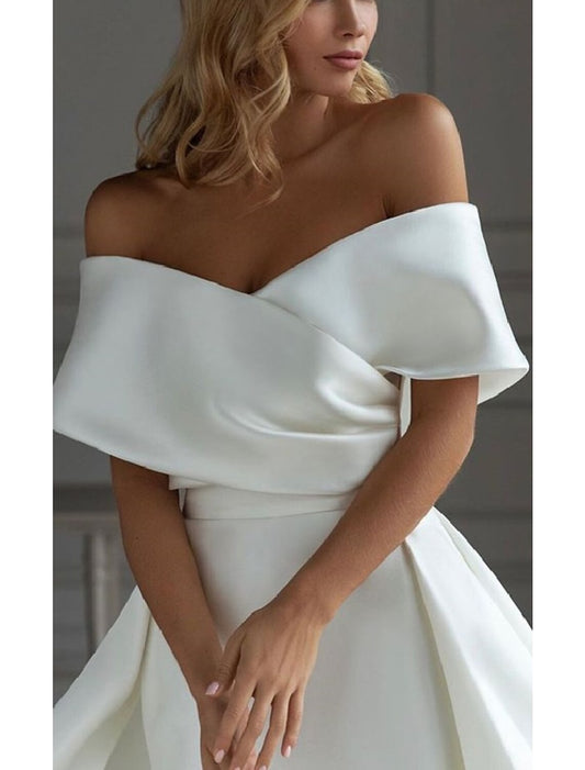 Engagement Formal Wedding Dresses Sheath / Column Off Shoulder Cap Sleeve Chapel Train Satin Bridal Gowns With Ruched Solid Color Summer Fall Wedding Party