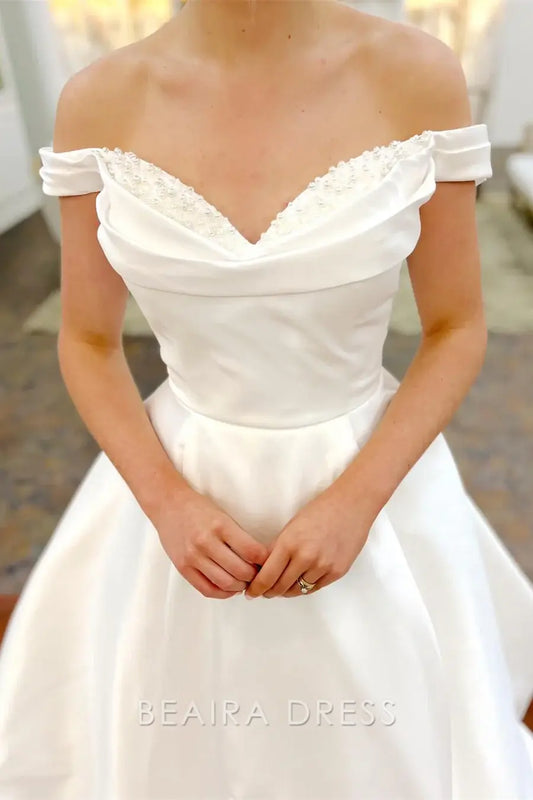 Beaira Elegant Off - the - Shoulder Ball Gown Wedding Dress with Embroidered Sweetheart Neckline and Full Satin Skirt for Timeless Bridal Grace
