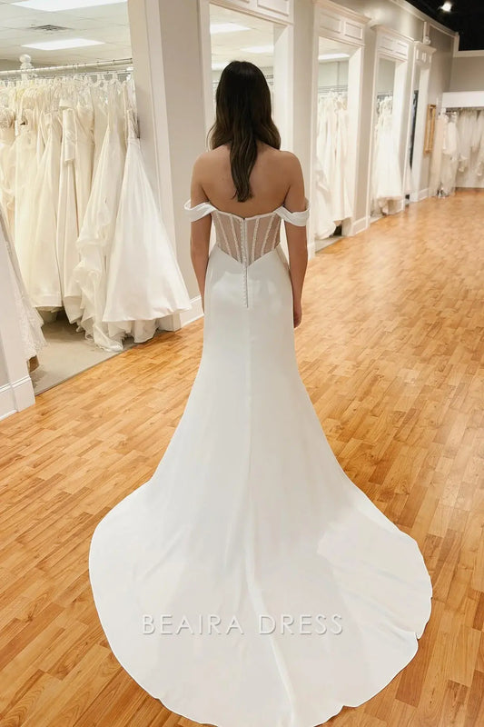 Beaira Elegant Off - the - Shoulder Mermaid Wedding Dress with Corset Bodice Sheer Side Details and High Slit for Modern Bridal Allure