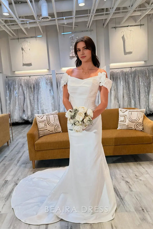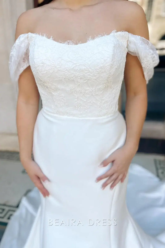 Beaira Elegant Off - the - Shoulder Mermaid Wedding Dress with Lace Bodice and Satin Skirt Featuring a Delicate Train for Romantic Bridal Elegance
