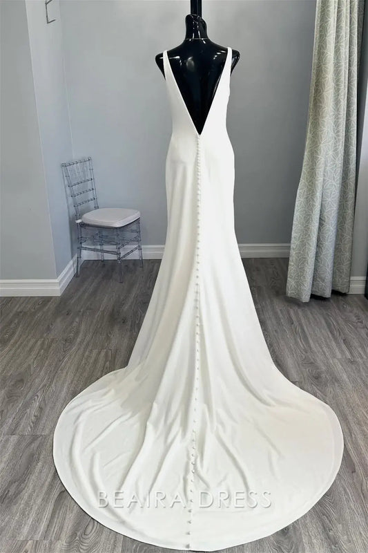 Beaira Elegant Plunging V - Neck Mermaid Wedding Dress with Minimalist Design and Flowing Train for Effortless Bridal Elegance