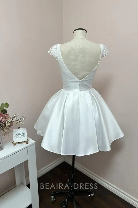 Beaira Elegant Short Ball Gown Wedding Dress with Plunging V - Neck Lace Cap Sleeves and Satin Skirt for Modern Bridal Charm