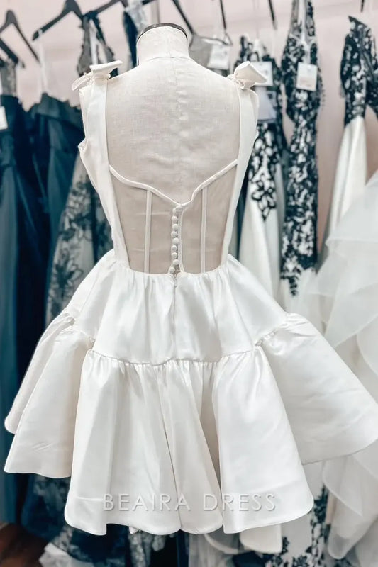 Beaira Elegant Square Neckline Tiered Skirt Mini Bridal Dress with Bow - Detailed Straps for Whimsical Bridal Charm
