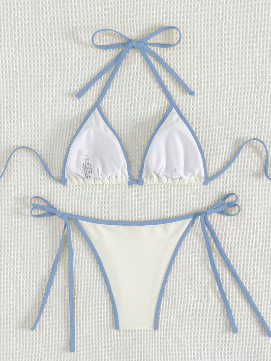Beaira Summer white and blue color-block bow-tie pure bikini set suitable for women's beach vacation