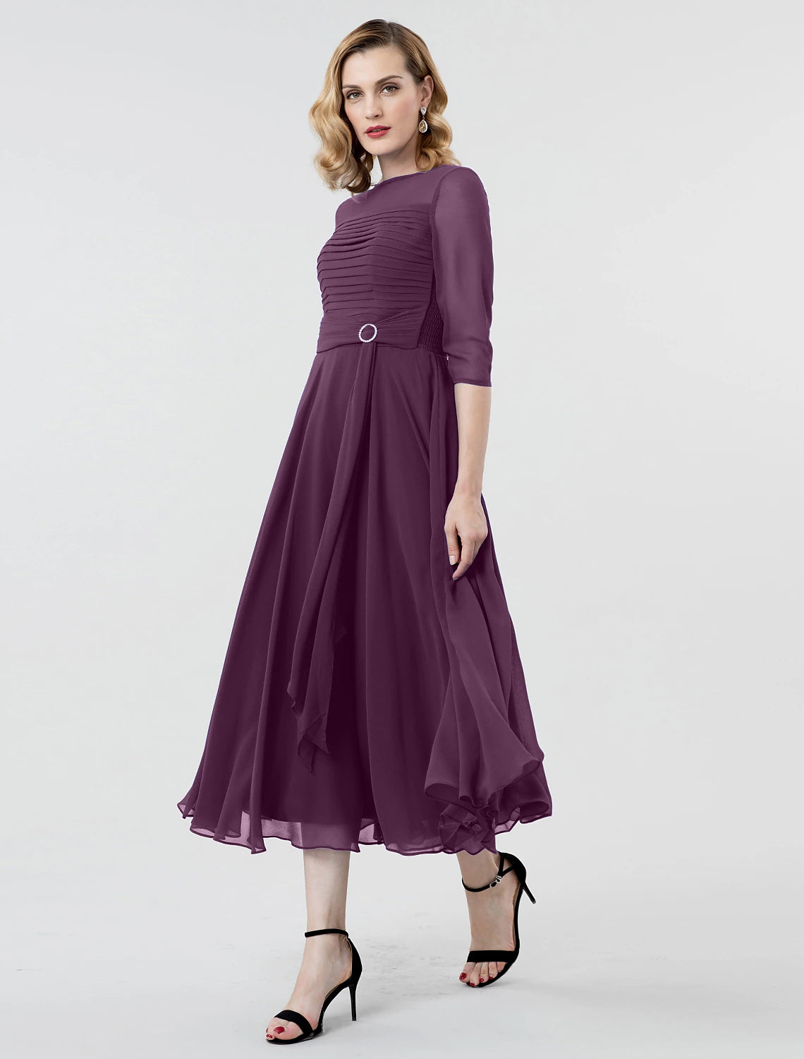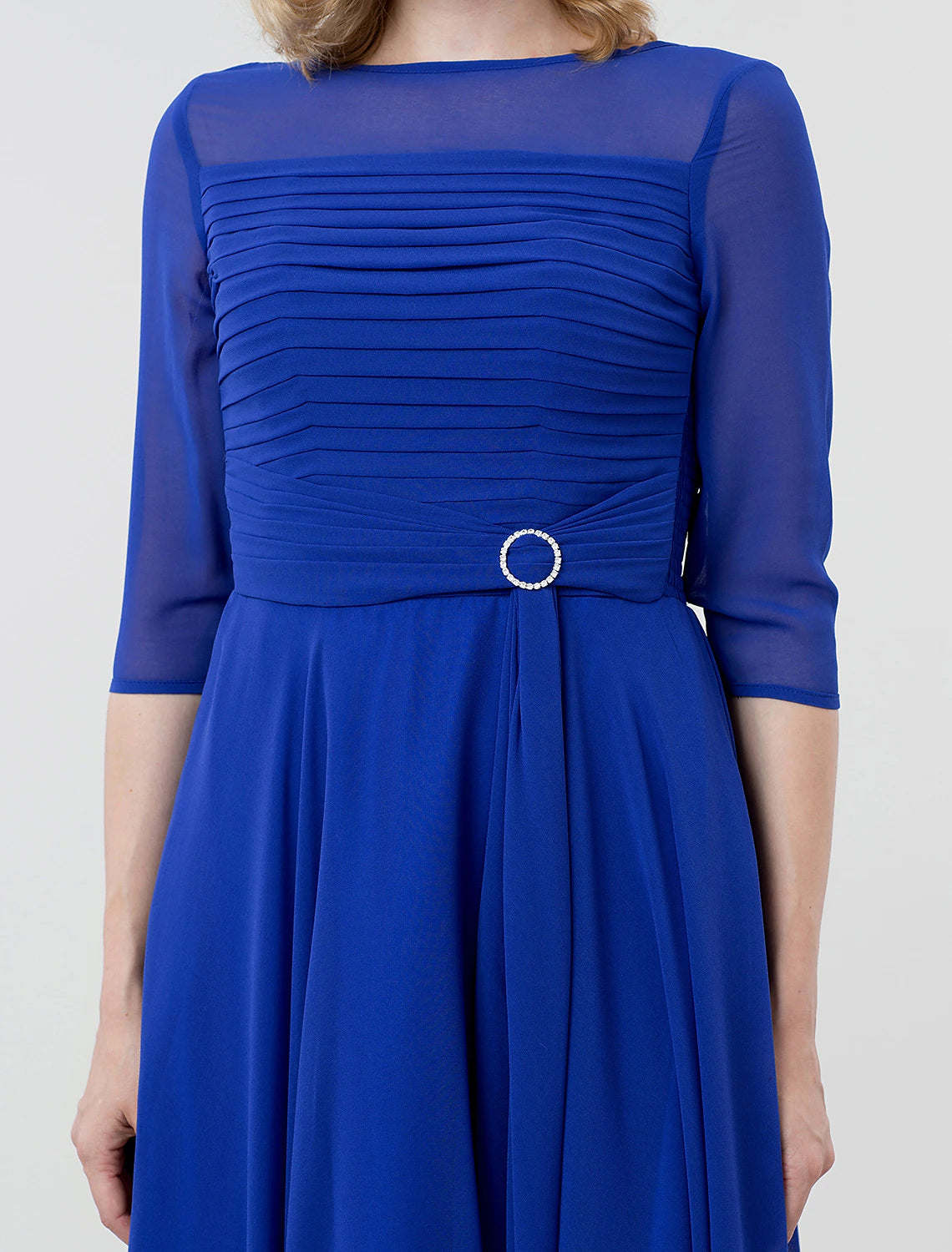 A-Line Elegant Formal Evening Wedding Party Dress Boat Neck 3/4 Length Sleeve Tea Length Georgette with Ruched Crystal Brooch