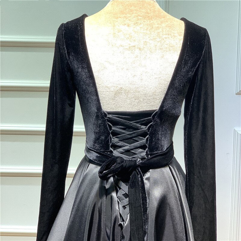 A line Long Sleeve Burgundy Prom Dresses Satin Deep V Neck High Slit Evening Dress