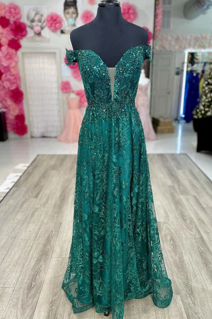 A Line Off the Shoulder Tulle Green Long Applique Prom Dresses With Slit