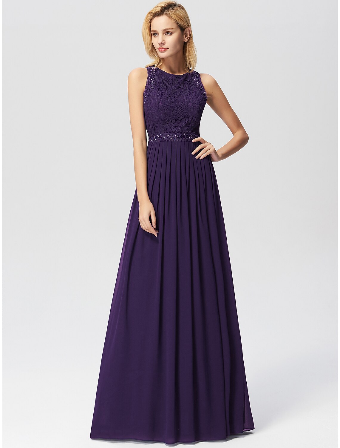A-Line Prom Dresses Maxi Dress Wedding Guest Prom Floor Length Sleeveless Jewel Neck Bridesmaid Dress Chiffon with Pleats Lace