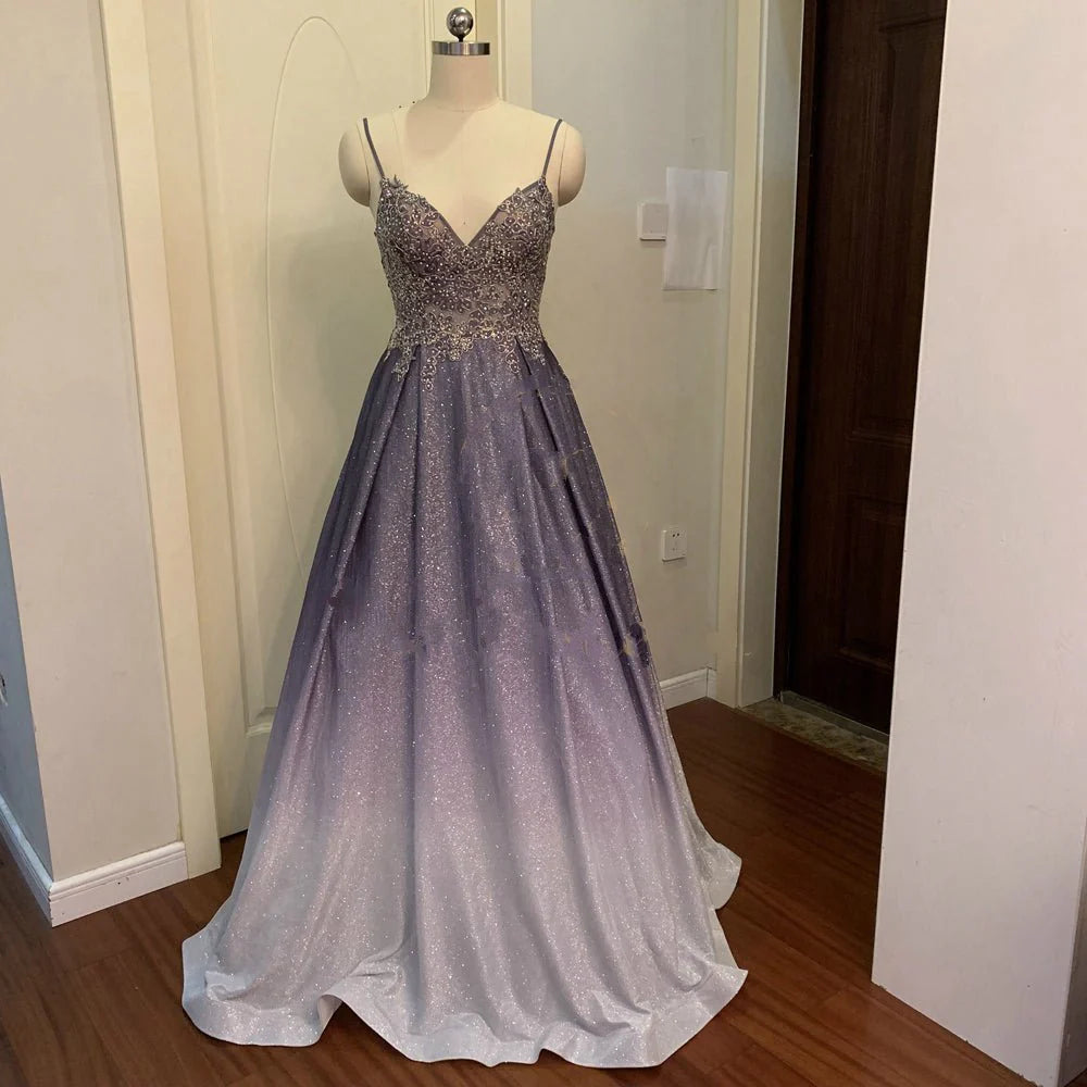 A Line Spaghetti Strap V Neck Sequin Beads Floor Length Prom Dresses With Lace Applique
