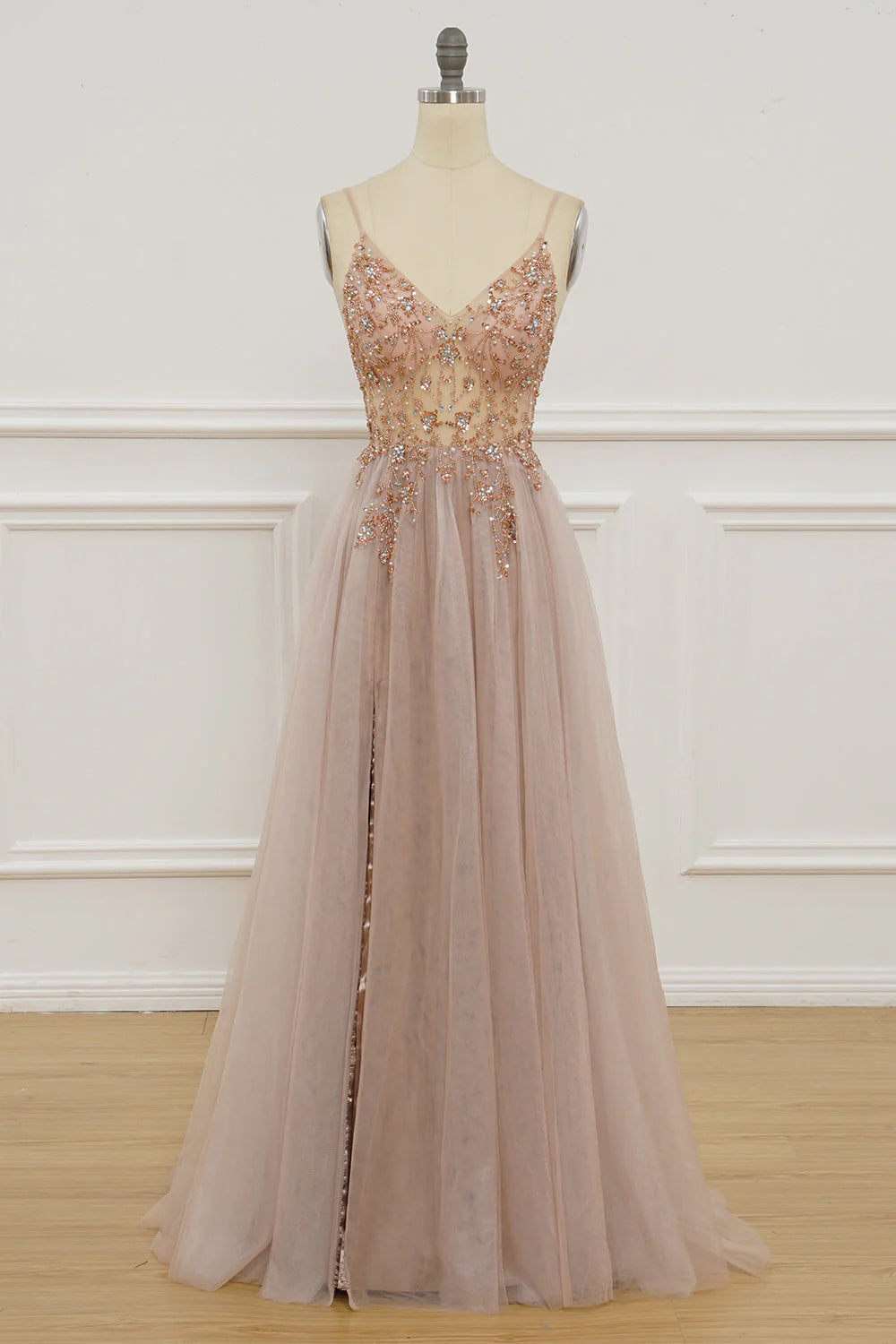 A Line Spaghetti Straps Deep V Neck Beads Tulle Prom Dresses with High Split
