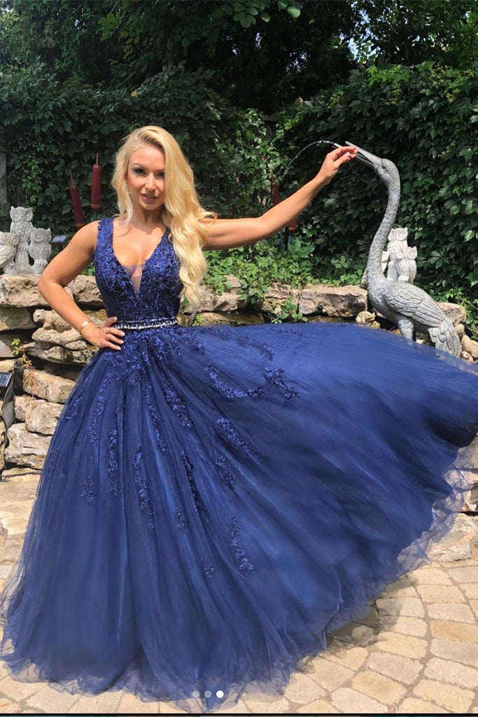 A Line Straps Tulle Prom Dresses V Neck Lace Appliques Long Formal Dresses