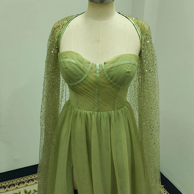 A Line Sweetheart Tulle Sage Long Slit Cape Wraps Prom Dresses