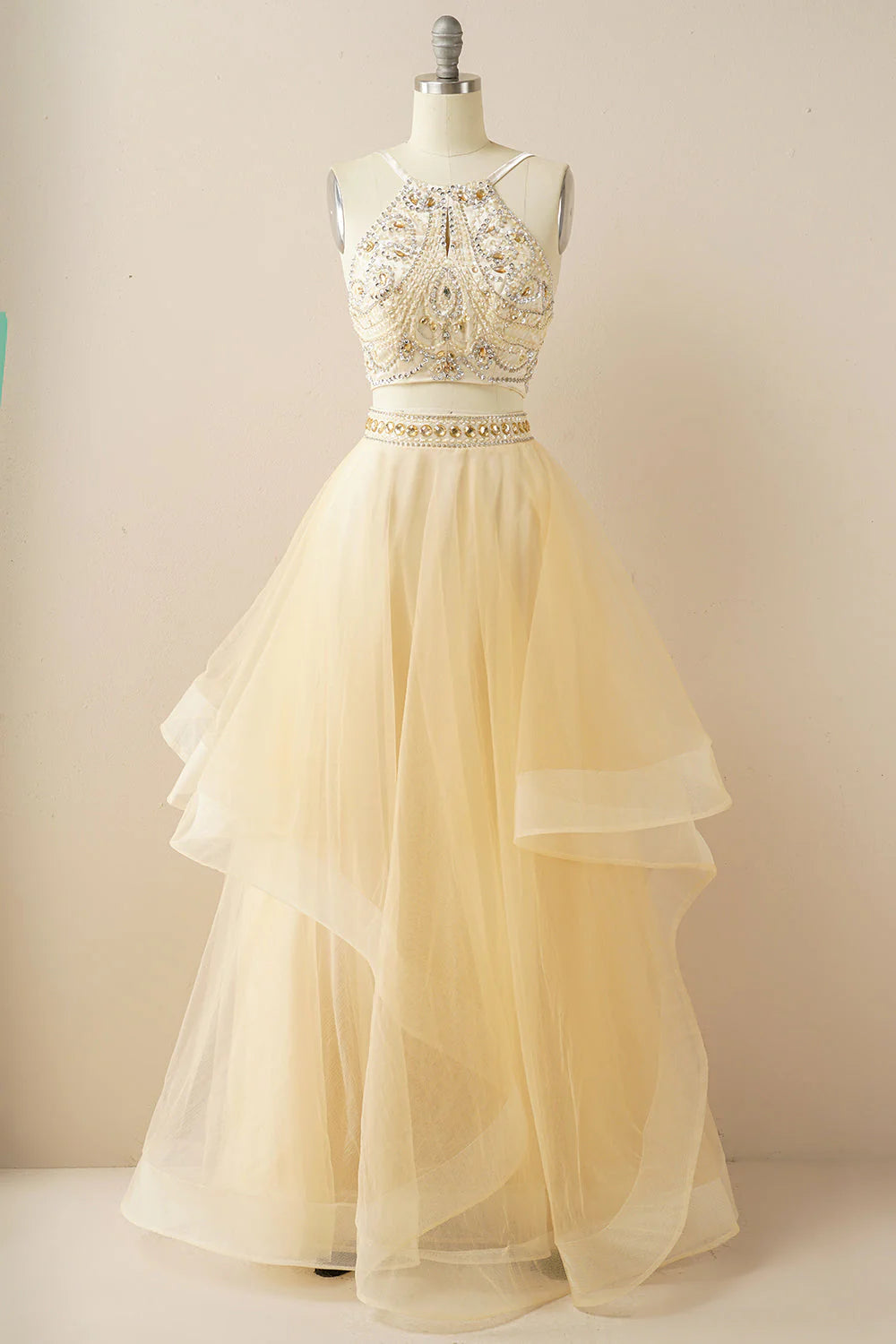 A Line Two Pieces Halter Long Tulle Backless Prom Dress with Beading