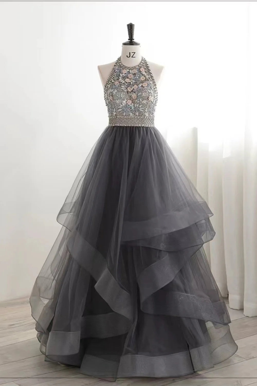 Ball Gown Halter High Low Prom Dresses Beading Asymmetrical Tulle Evening Dresses