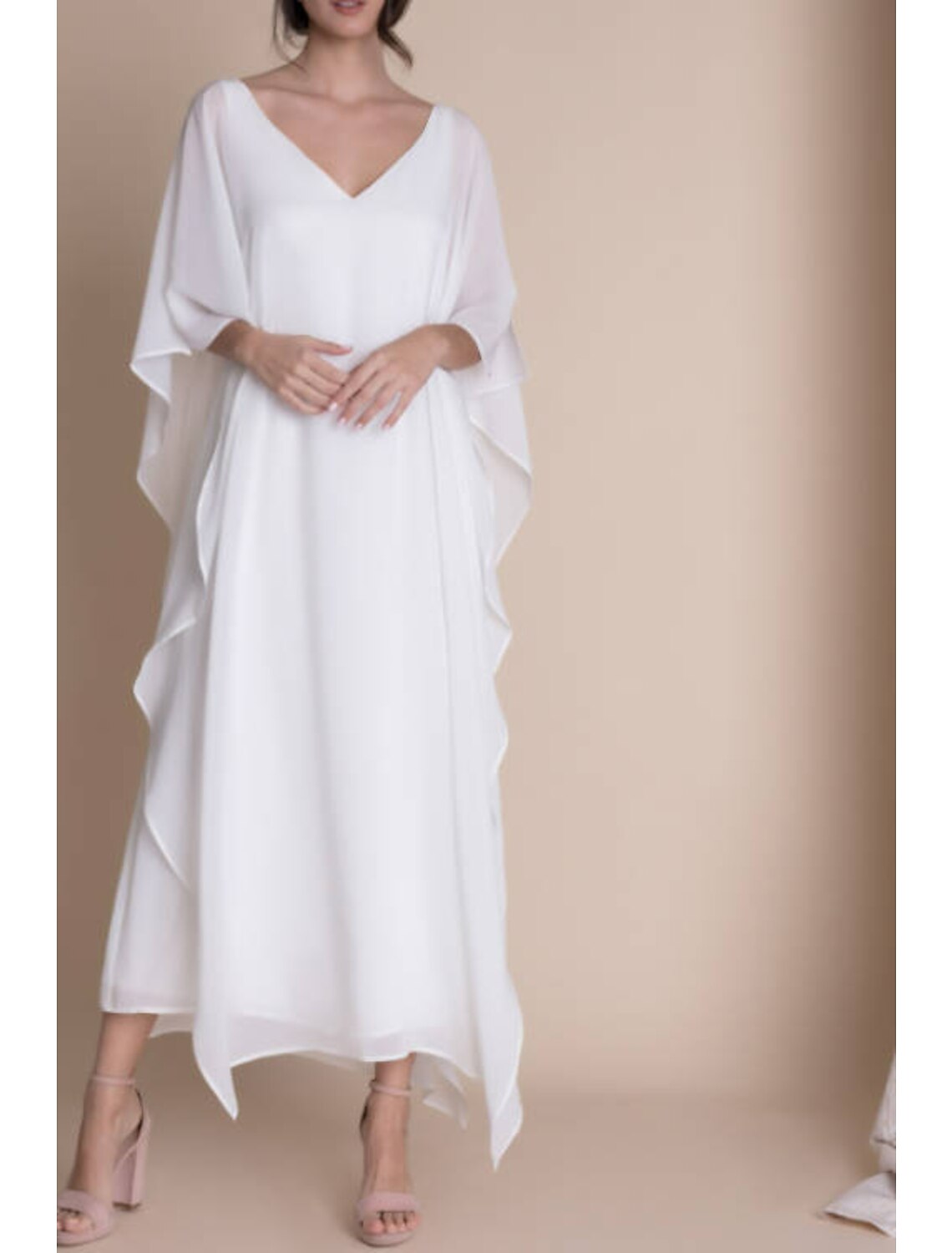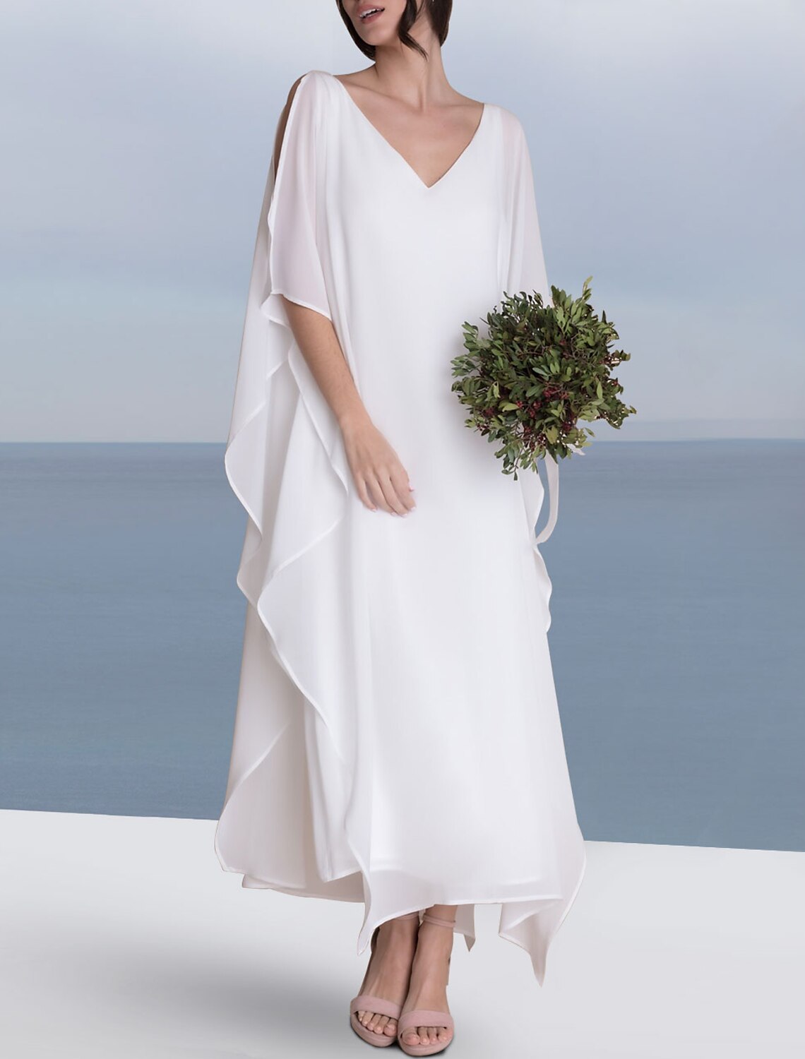 Beach Little White Dresses Wedding Dresses A-Line V Neck Half Sleeve Tea Length Chiffon Bridal Gowns With Solid Color