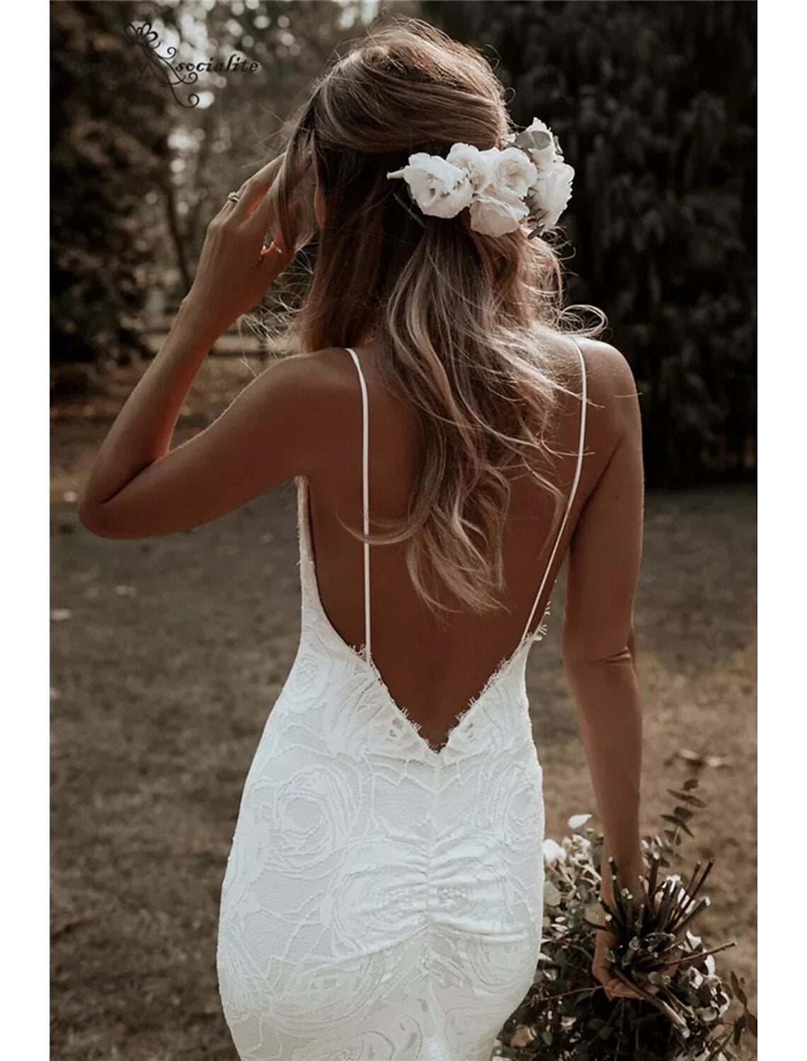 Beach Open Back Sexy Boho Wedding Dresses Mermaid / Trumpet Camisole V Neck Spaghetti Strap Court Train Lace Bridal Gowns With Appliques