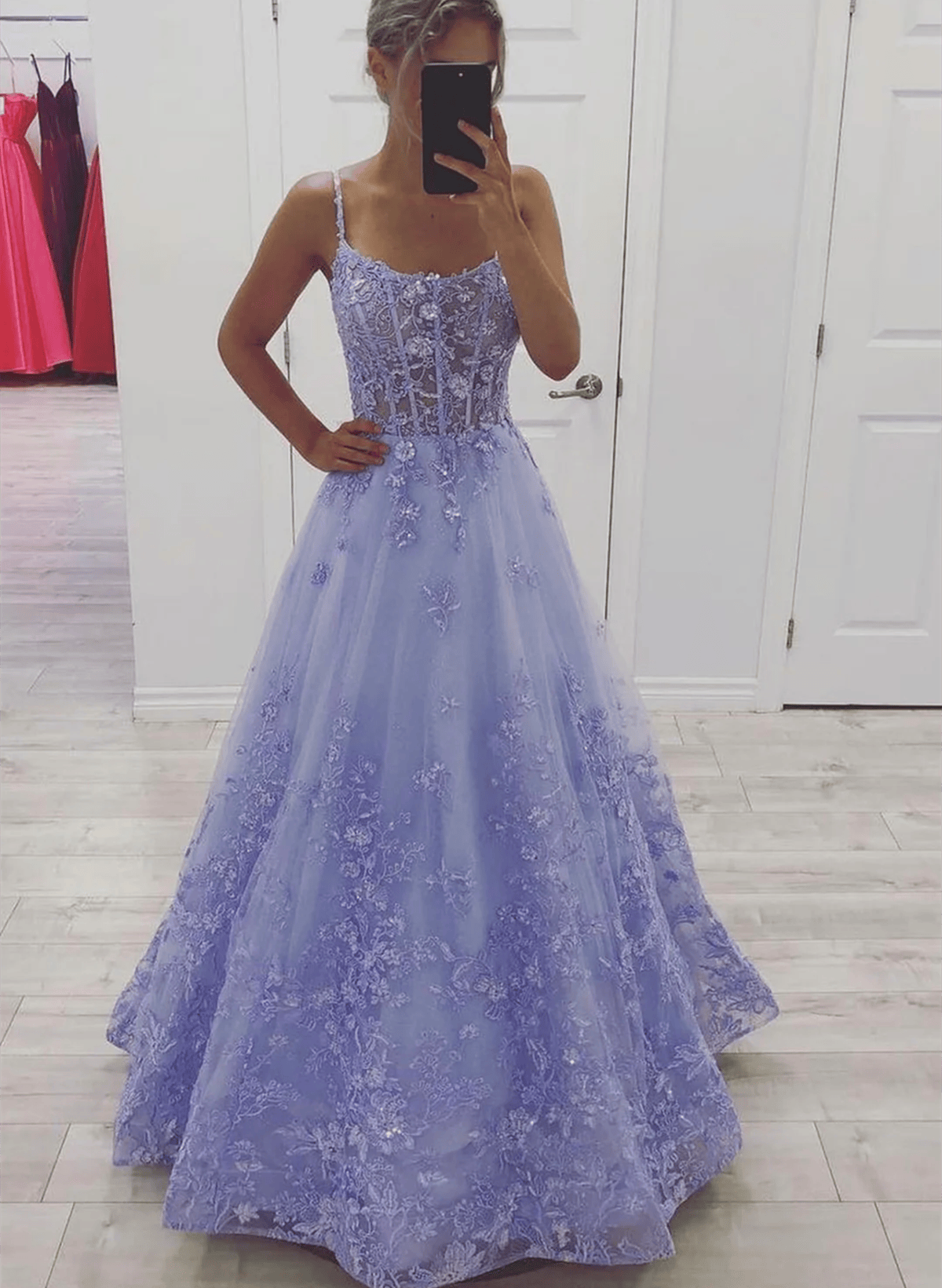 Beaira Lavender Tulle Straps Lace Long Formal Dress Lavender Evening Dress