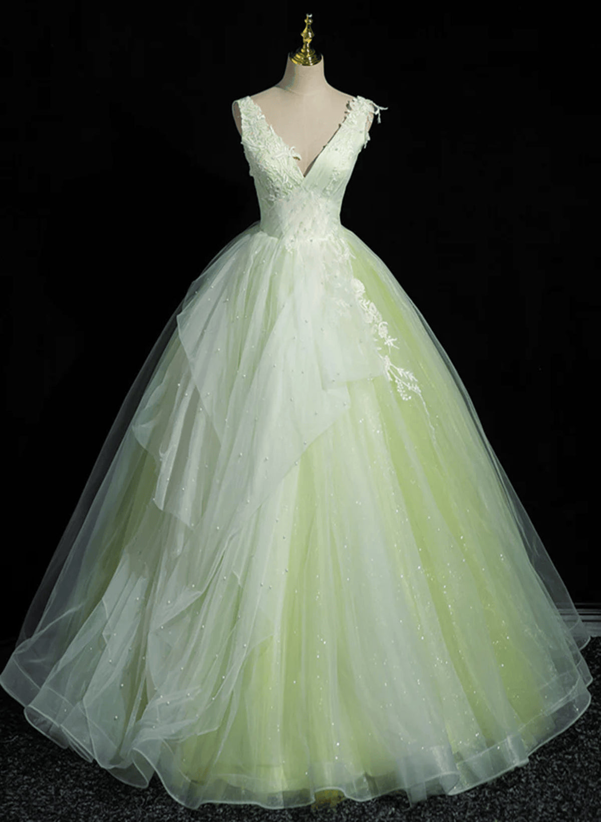 Beaira Light Green Tulle V-neckline Long Formal Dress Light Green Sweet 16 Dress
