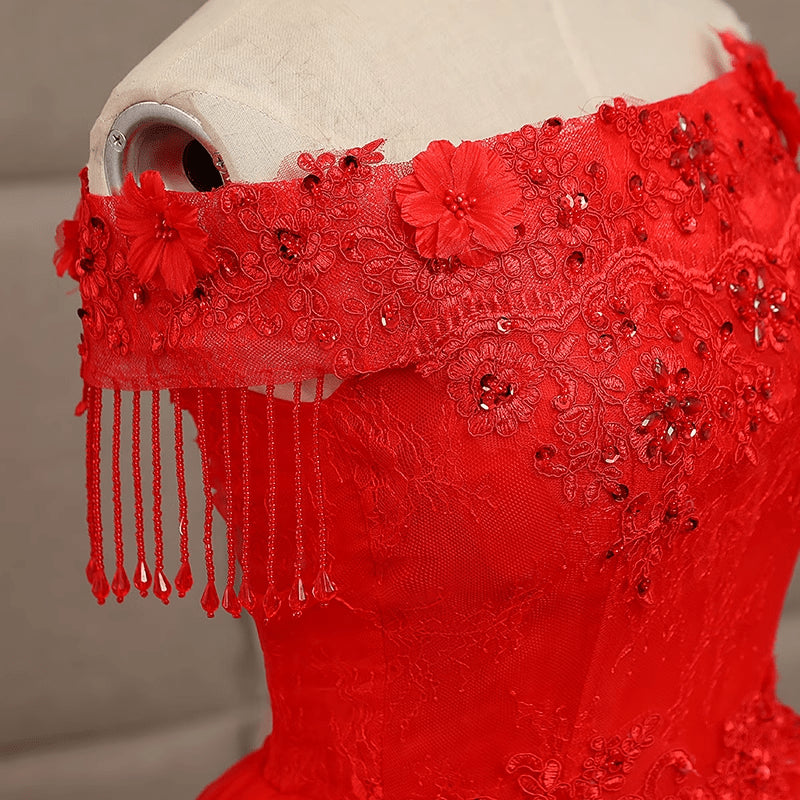 Beaira Red Off Shoulder Ball Gown Tulle Sweet 16 Dress Red Tulle Long Party Dress prom dresses with long sleeves