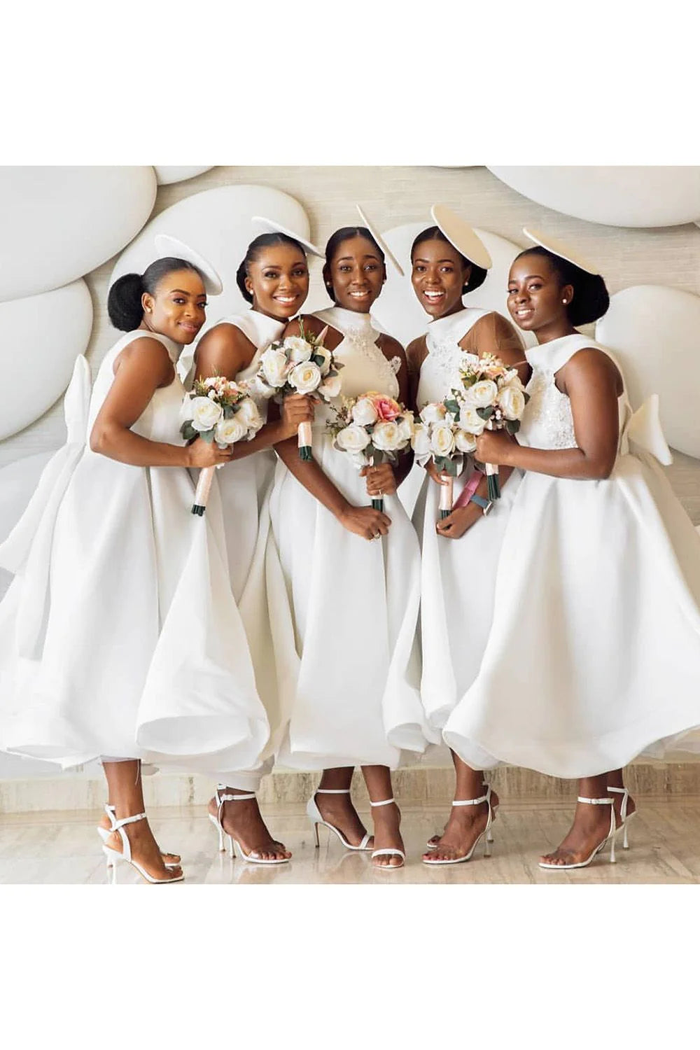 Bridesmaid Dresses A Line Scoop Lace Appliques Satin With Bowtie