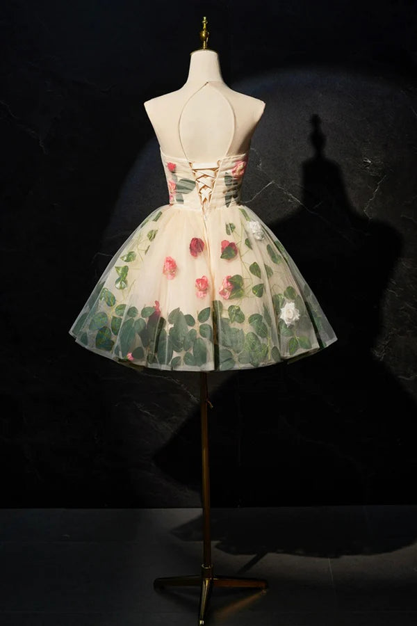 Cute Scoop Neck Short Prom Dress with Flowers Champagne A-Line Party Dress