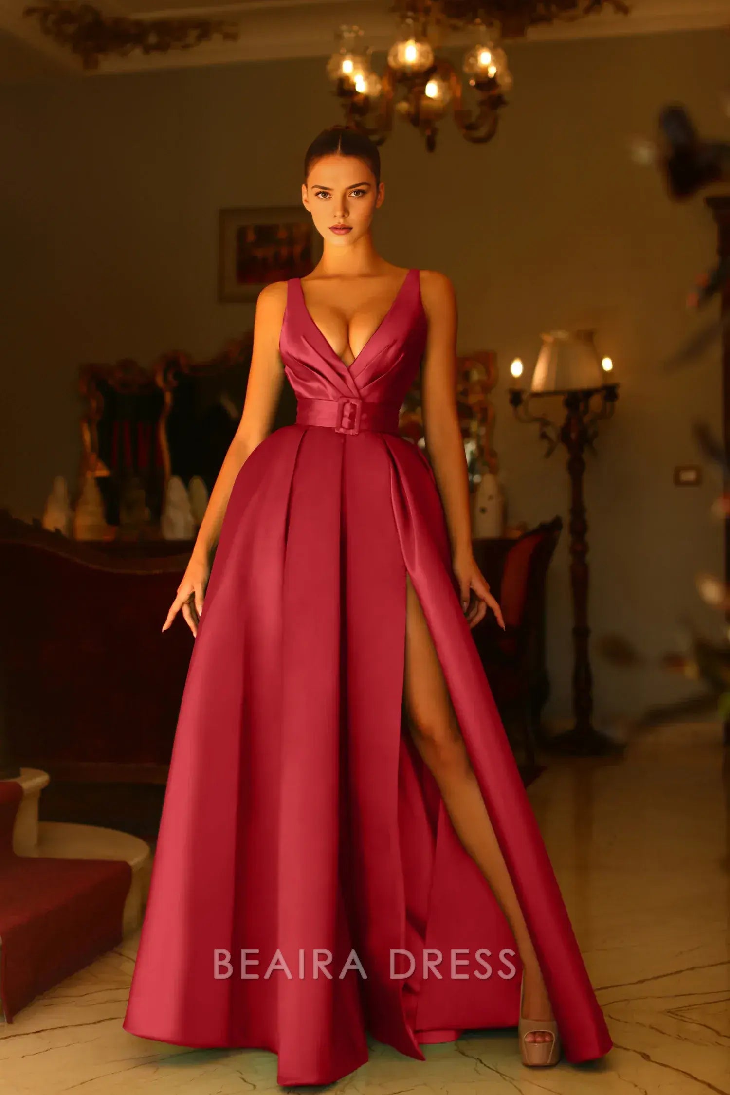 Step into glamour with Beaira's deep V - neck satin maxi dress. The deep V - neckline and satin fabric create a luxurious silhouette, while the side slit adds allure and the belt cinches the waist for a flattering fit. Perfect for formal events, galas,prom, or special occasions, this dress combines elegance and sophistication seamlessly.