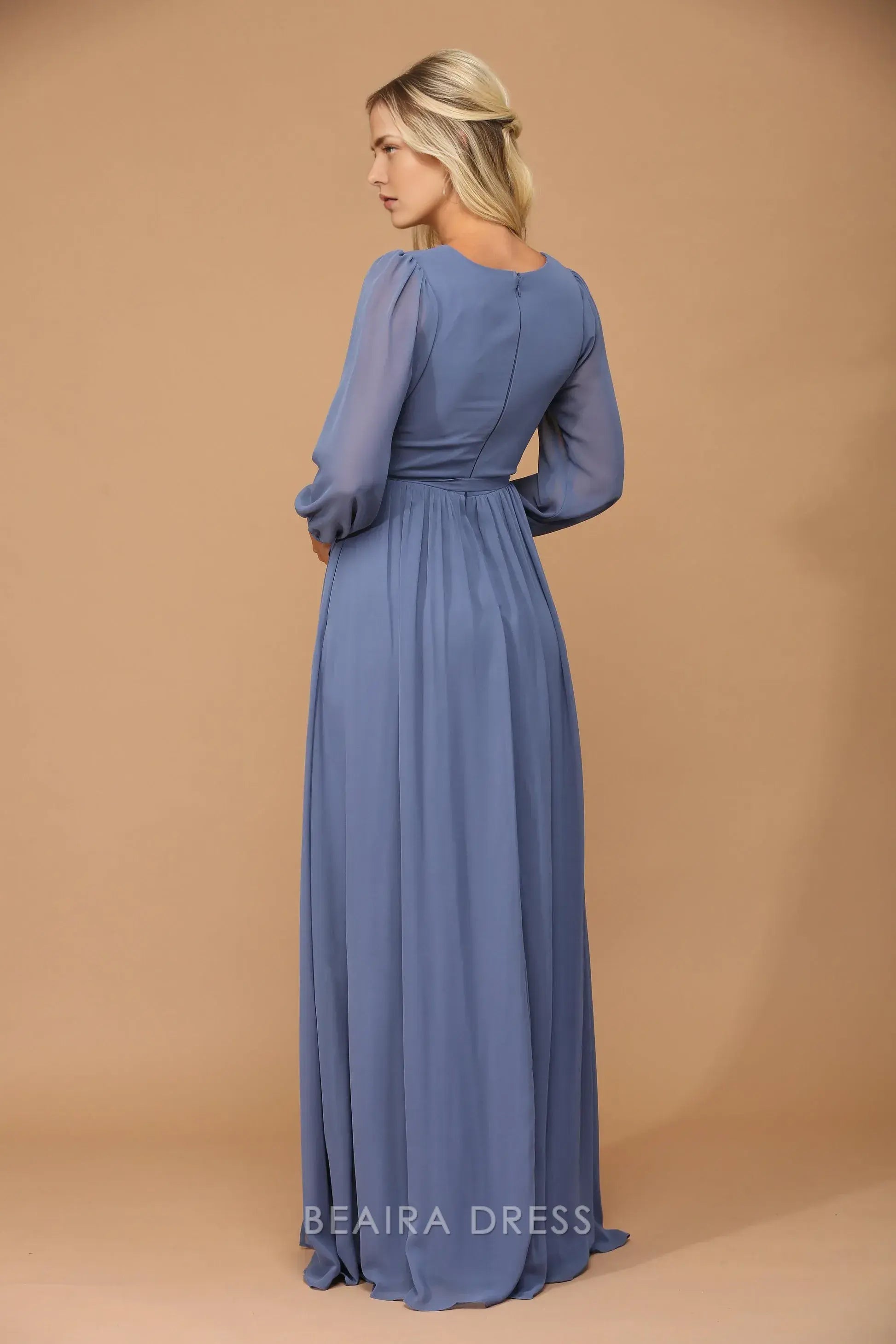 Embrace elegance with Beaira's long sleeve chiffon wrap maxi dress. The lightweight chiffon fabric flows beautifully, while the wrap design and tie waist create a flattering silhouette. Long sheer sleeves add a touch of sophistication, making it perfect for weddings,prom, bridal showers, or other formal events.
