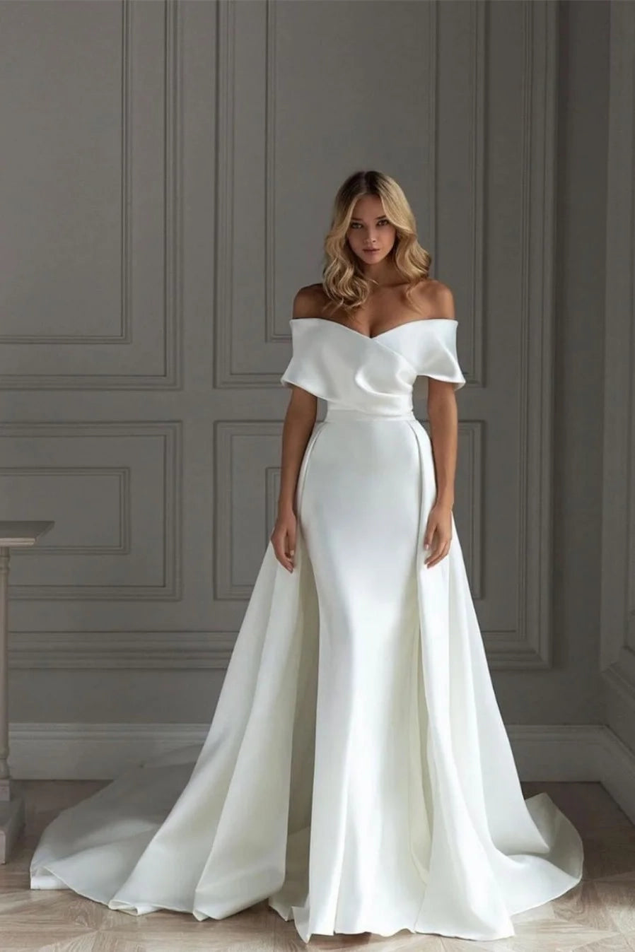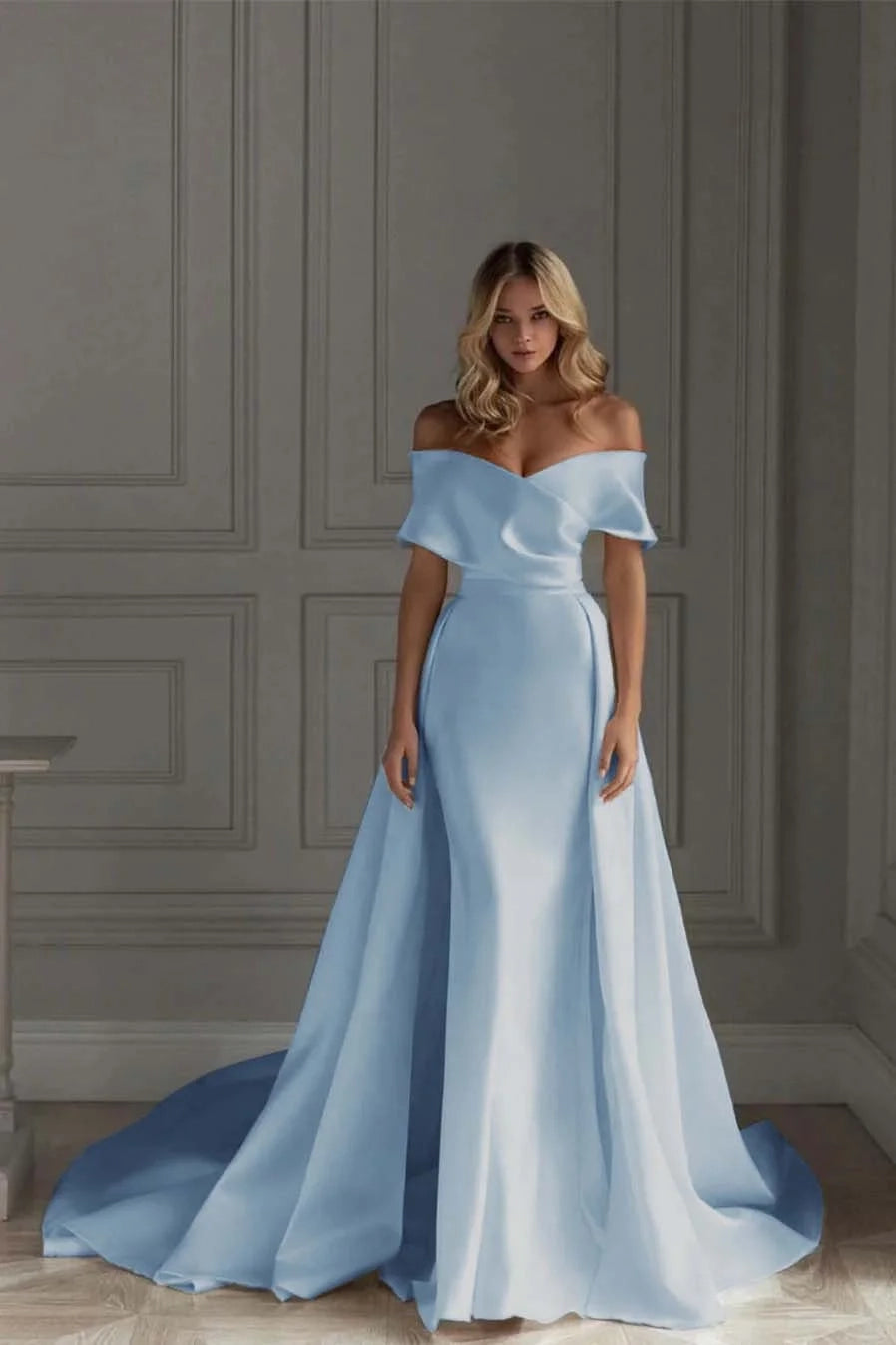 Beaira's glamorous party dress is crafted from luxuriously smooth satin, featuring a figure-hugging mermaid silhouette with a floor-length hem and a dramatic sweeping train. It boasts a romantic off-the-shoulder neckline with a folded satin overlay that adds a touch of old Hollywood elegance. The structured bodice is tailored to cinch the waist, transitioning into a sleek skirt that hugs the hips before flaring into a full, flowing train. The back features a concealed zipper closure for a seamless finish, while the satin fabric offers a rich, lustrous sheen that catches the light beautifully, enhancing the vibrant hue of each color option.