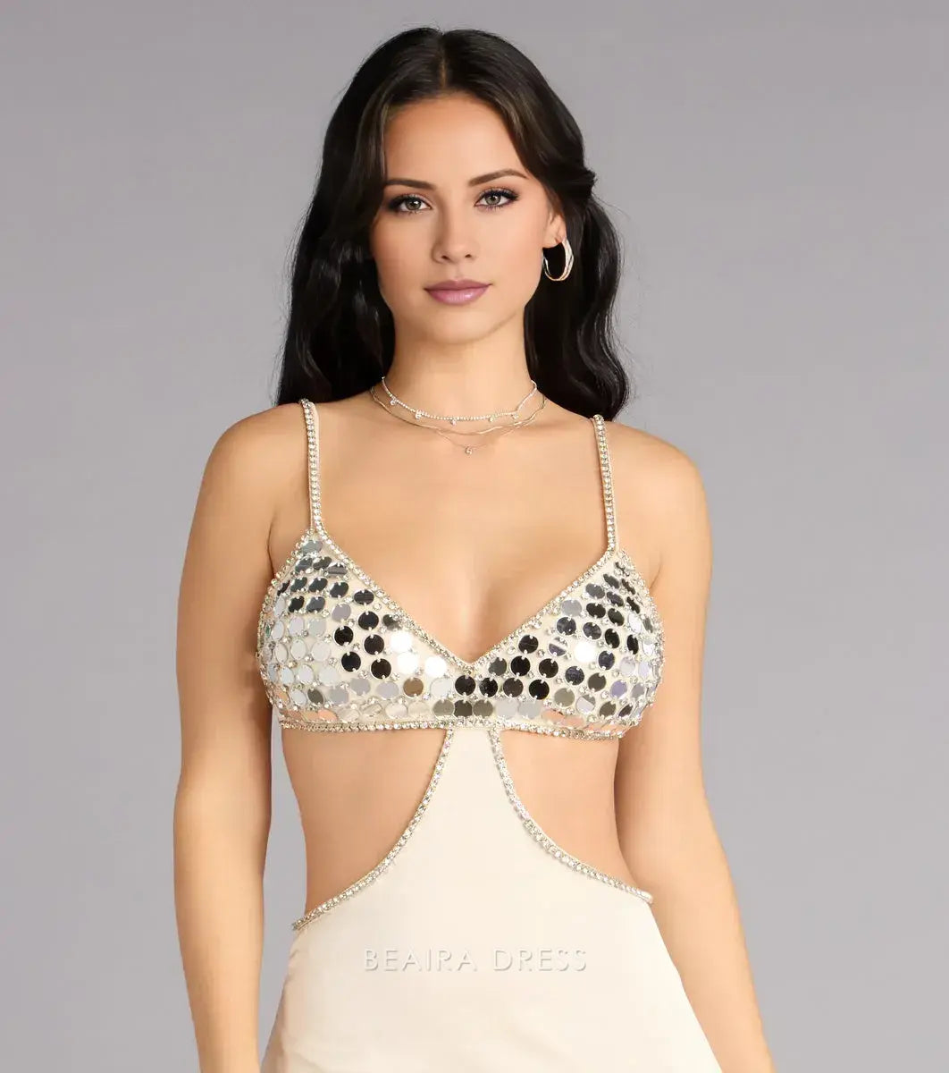 Step into glamorous allure with Beaira's halter neck sequin cutout satin maxi dress. The halter-style neckline (adorned with sparkling black-and-silver sequins) and deep V-cut torso cutouts highlight your silhouette dramatically, while the smooth satin skirt adds layers of elegance. The soft ivory hue creates a stunning, luminous fit, perfect for red-carpet events or formal galas. The contrast of shimmering sequins and flowing satin further elevates its appeal, ensuring you stand out at any upscale occasion.