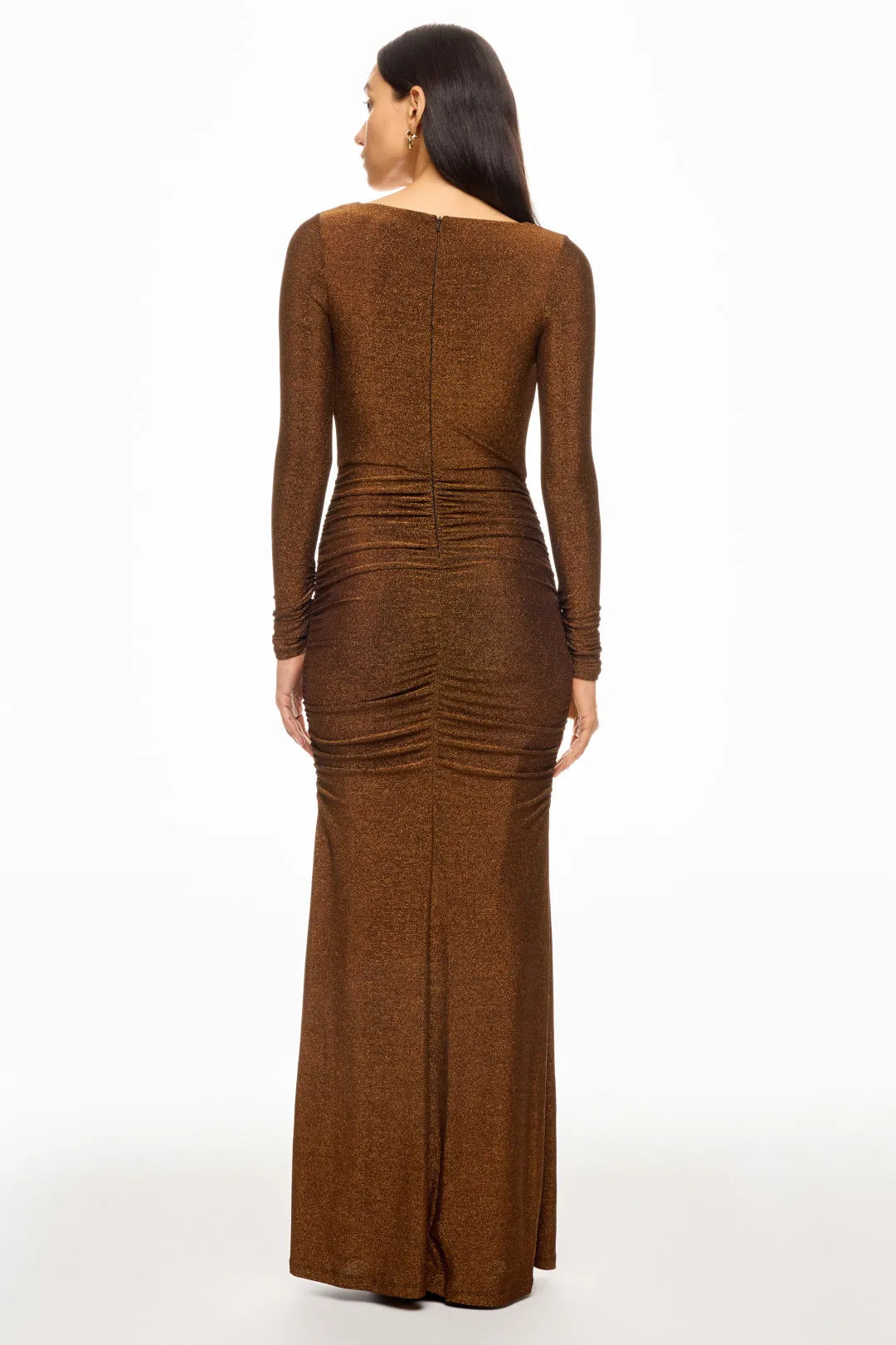 Step into shimmering elegance with Beaira's long-sleeve ruched metallic mermaid maxi dress. The warm bronze metallic fabric, draped cowl V-neckline, and strategic ruched detailing create a body-contouring, glamorous silhouette. The full-length sleeves add refined coverage, making it ideal for holiday parties, New Year’s galas, or upscale evening events. The luminous metallic material catches light beautifully, ensuring you stand out with timeless sophistication at any celebratory occasion.