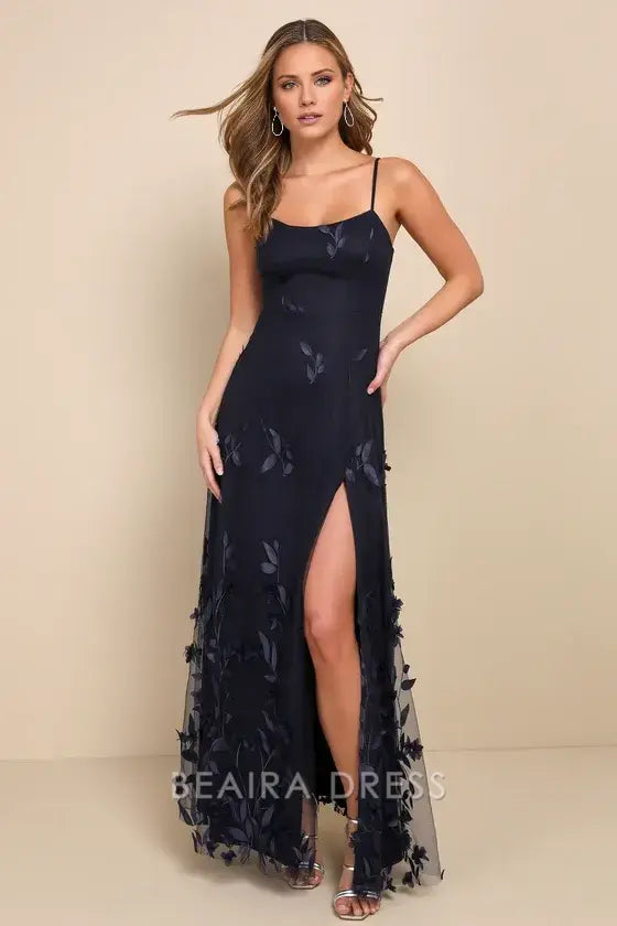 Gorgeous for women Navy Blue Chiffon Spaghetti Strap Square Neck 3D Leaf Appliqué High Slit A-Line Maxi Dress Prom Dress(Available in Plus Size)