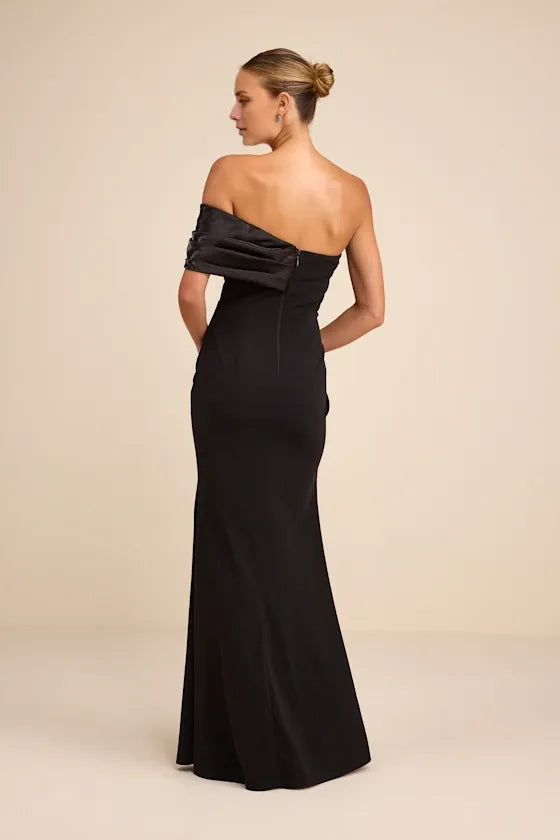 Step into sleek sophistication with Beaira's off-the-shoulder draped satin high-slit mermaid maxi dress. The classic black satin fabric, asymmetric draped neckline, and dramatic thigh-high slit create an alluring, polished silhouette. The open-back design adds refined charm, making it ideal for formal dinners, wedding receptions, or upscale evening events. The lustrous satin material ensures a timeless look, exuding elegance at any refined occasion.
