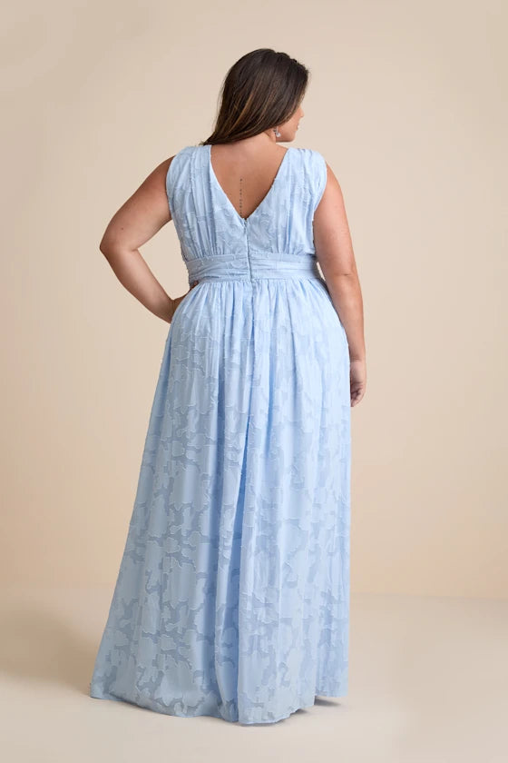 Embrace airy elegant charm with Beaira's light blue formal gown, crafted from soft textured fabric (with subtle dimensional detailing). It features a sleek sleeveless deep V-neck (front and back), a smocked waist (for tailored comfort), and a dramatic high slit paired with a flowing A-line floor-length skirt. Designed in inclusive sizes (to flatter diverse silhouettes), this gown balances sophistication and ease, making it ideal for wedding guest events, evening dinners, upscale cocktail gatherings, or semi-formal celebrations. Its delicate hue and polished design deliver a graceful, memorable appearance.