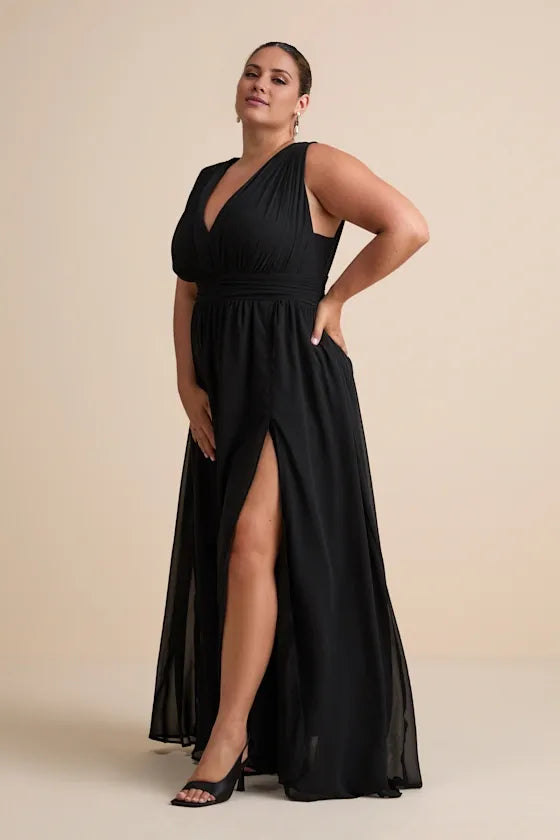 Step into effortless elegance with Beaira's sleeveless plunging V-neck chiffon high-slit maxi dress (available in plus sizes). The lightweight black chiffon fabric, deep V-neckline, and flowing A-line skirt create a comfortable, alluring silhouette. The dramatic high slit and open back add refined charm, making it ideal for daytime weddings, cocktail parties, or upscale casual events. The breathable chiffon material ensures a flattering fit for all body types, exuding grace at any polished occasion.