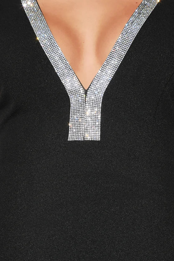 Step into sleek glamour with Beaira's sleeveless sequin-trimmed plunging V-mermaid maxi dress. The classic black fabric, sparkling sequin neckline trim, and dramatic high slit create an alluring, modern silhouette. The deep V-neckline and open back add bold charm, making it ideal for nightclub events, formal after-parties, or upscale evening gatherings. The stretchy, body-contouring material ensures a flattering fit, exuding confidence at any polished occasion.