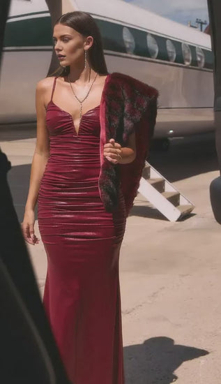 Step into elegance with Beaira's plunge neck ruched metallic mermaid maxi dress. The plunge neck design with ruched detailing highlights your neckline and curves beautifully, while the metallic fabric exudes luxury and glamour. The mermaid cut creates a stunning, curvy silhouette, perfect for formal events or special occasions. The rich burgundy hue and tailored design further elevate its timeless, sophisticated appeal, ensuring you stand out at any glamorous gathering.