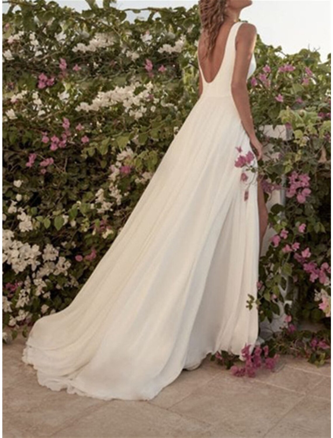 Hall Casual Wedding Dresses A-Line Scoop Neck Sleeveless Floor Length Chiffon Bridal Gowns With Split Front