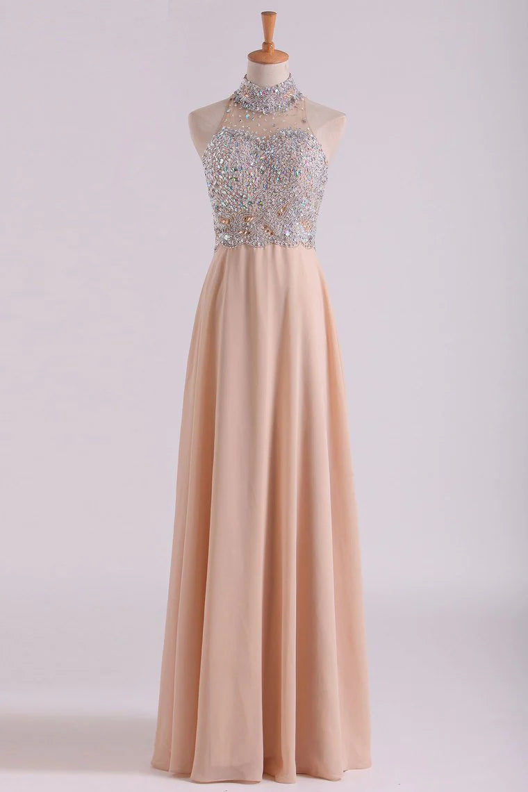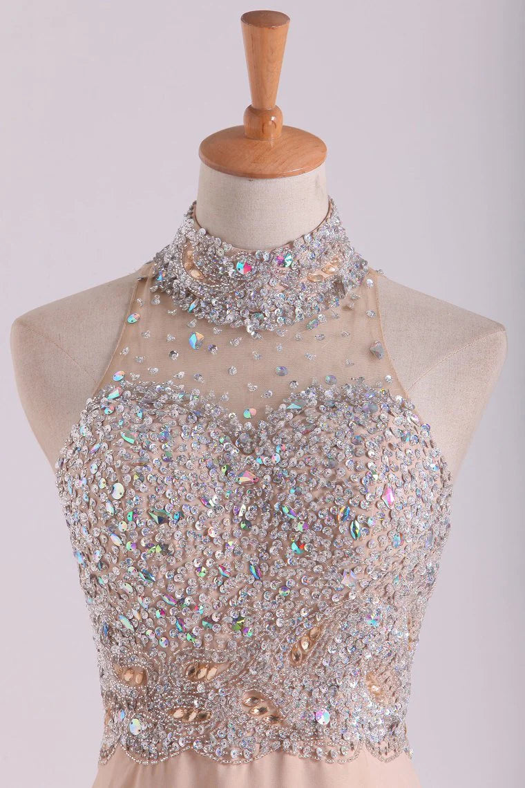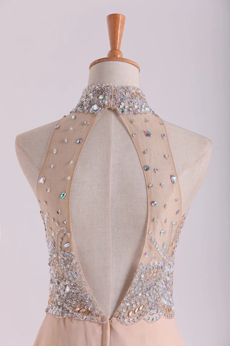 High Neck Party Dresses A Line Chiffon Sweep Train