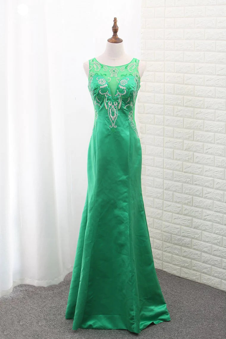 Mermaid Satin Scoop Party Dresses With Embroidery Floor Length