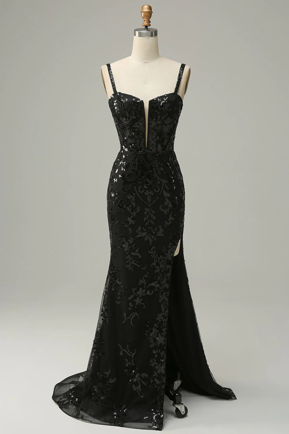 Mermaid Spaghetti Straps Red Sequins Long Prom Dress with Split Front