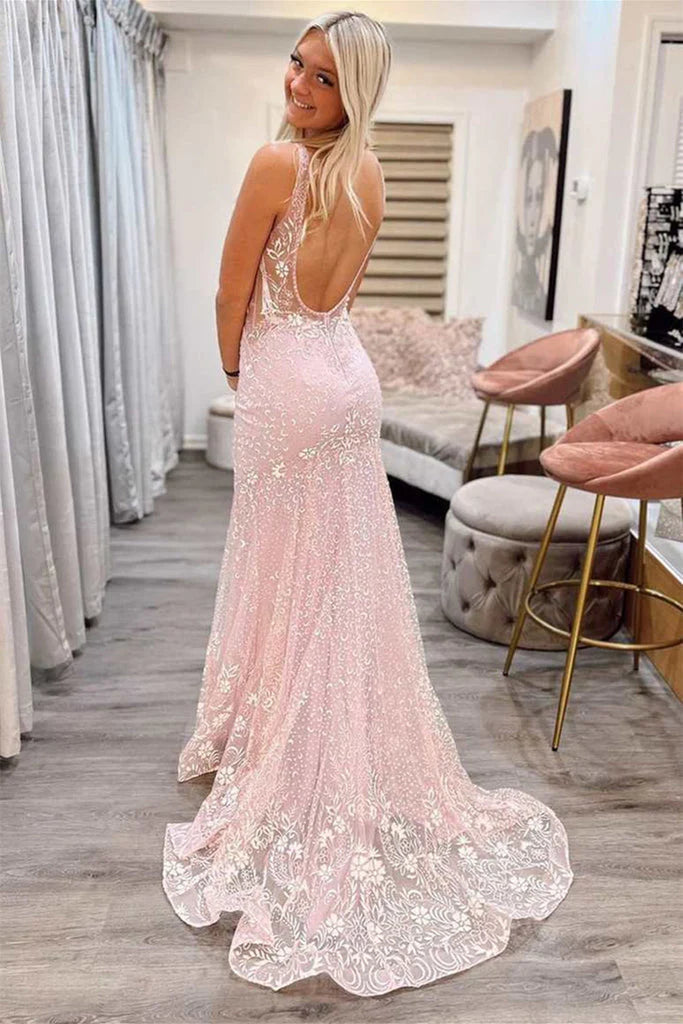 Mermaid V Neck Pink Lace Backless Long Prom Dresses