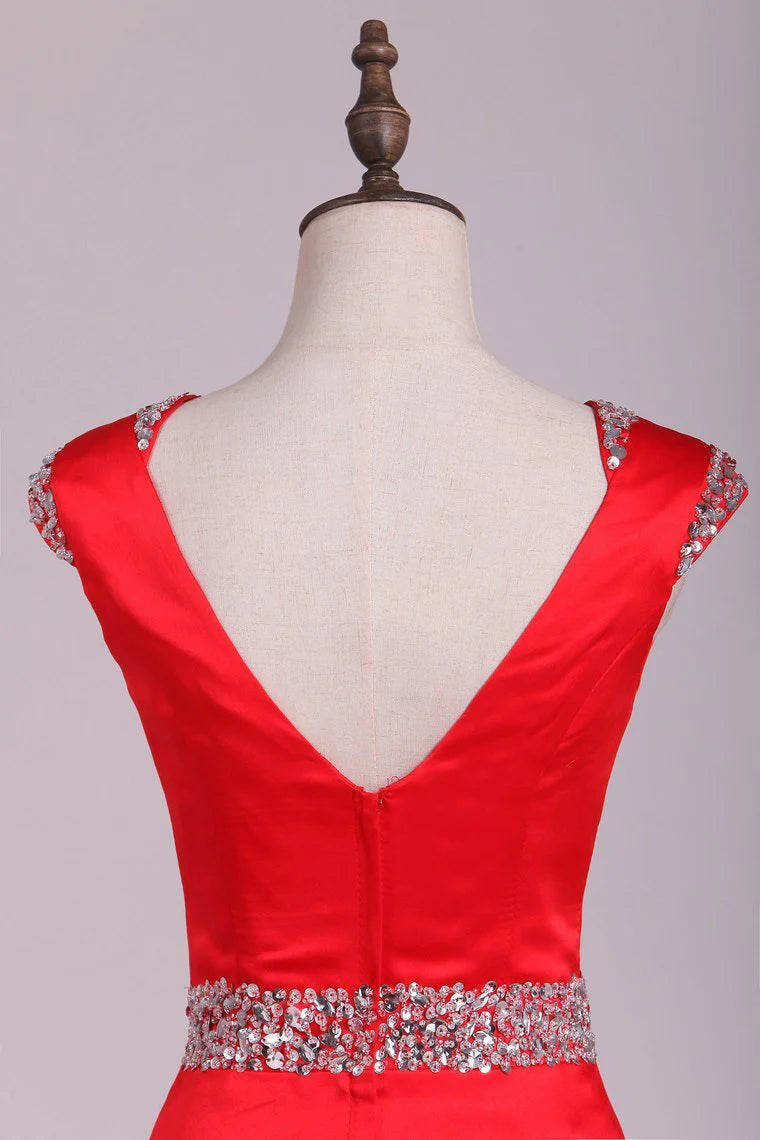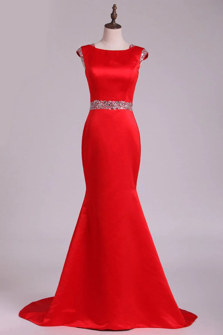 Party Dresses Scoop Beaded Waistband Satin Sweep Train Mermaid