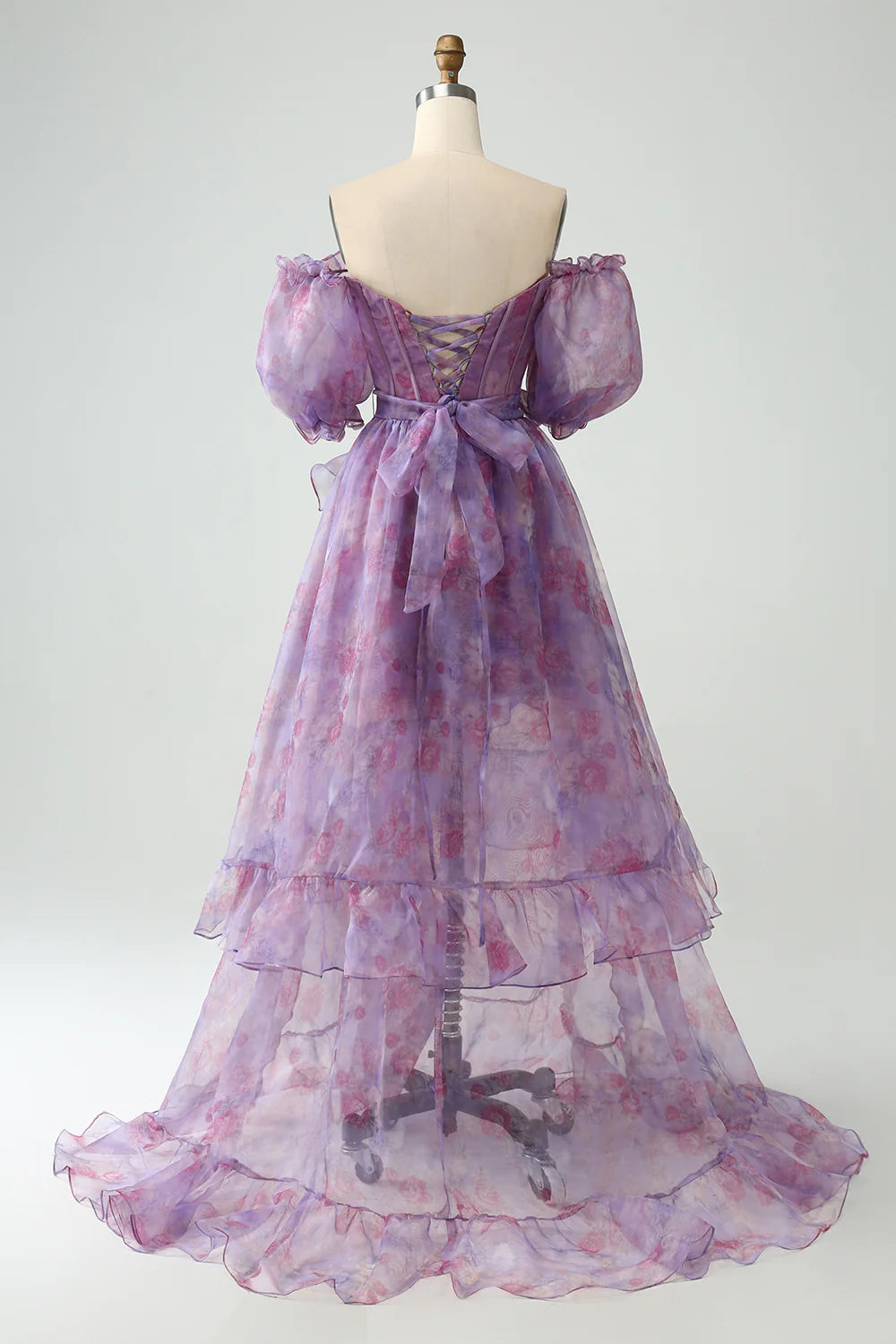 Purple A Line Square Neck Corset Prom Dress With Slit