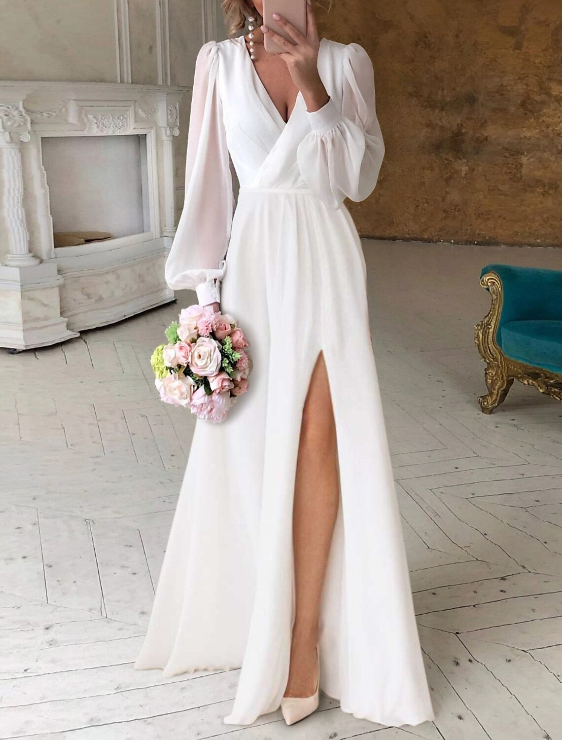 Reception Little White Dresses Simple Wedding Dresses A-Line V Neck Long Sleeve Floor Length Chiffon Bridal Gowns With Ruched
