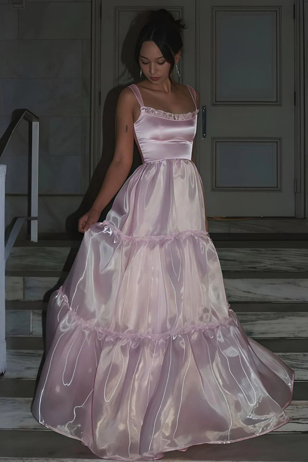 Romantic Square Neck Tiered Blush Pink Floor-Length Prom Dress